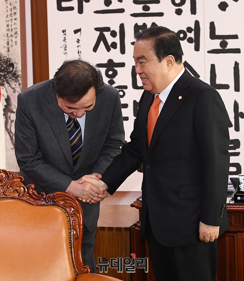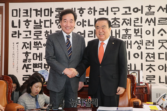 문희상 국회의장이 15일 오전 국회 의장실에서 이낙연 전 국무총리의 예방을 받고 기념촬영을 하고 있다.