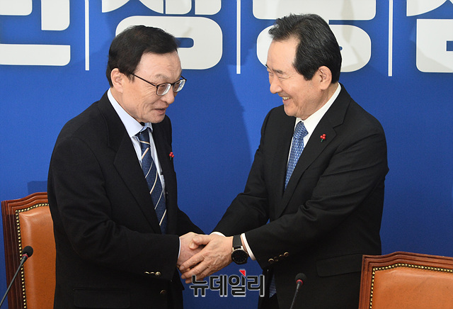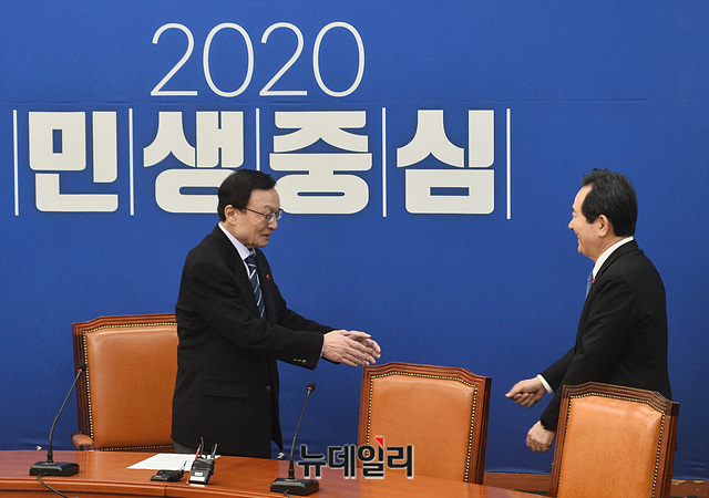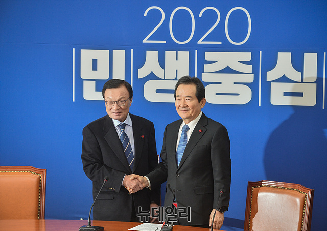 이해찬 더불어민주당 대표가 15일 오후 국회에서 정세균 신임 국무총리의 예방을 받고 악수를 나누고 있다.