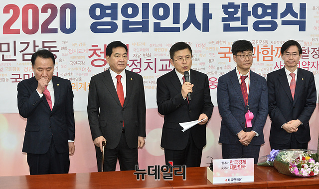 황교안 자유한국당 대표가 16일 오전 국회에서 열린 '2020년 자유한국당 영입 인사 환영식'에서 인사말을 하고 있다. 이날 한국당은 네 번째 영입 인사에 '산재 공익신고자' 이종헌 씨를 임명했다.
