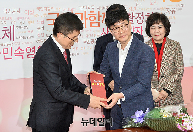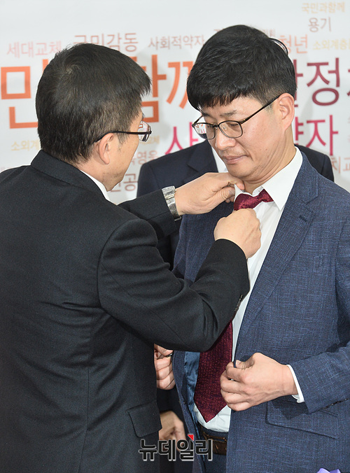 [포토] 붉은 넥타이 선물받는 한국당 4호 영입인재 이종헌 씨