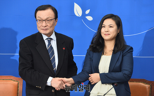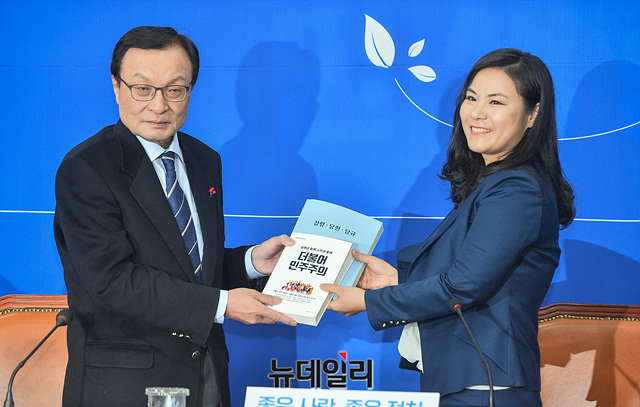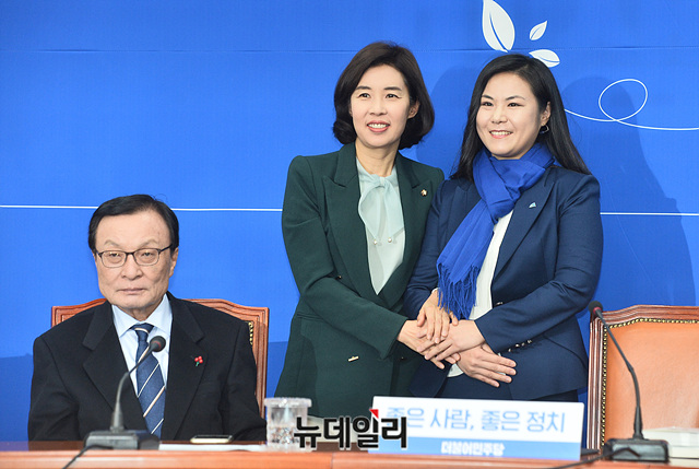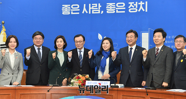 이해찬 더불어민주당 대표, 영입 인재 9호로 임명된 최지은 박사 등 참석자들이 16일 오전 국회에서 열린 '민주당 인재 영입 행사'에서 기념촬영을 하고 있다.