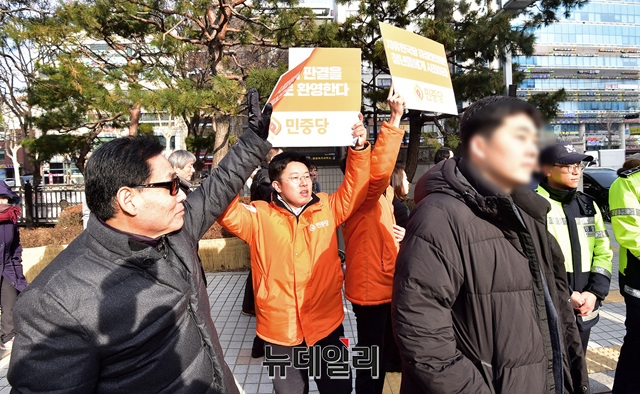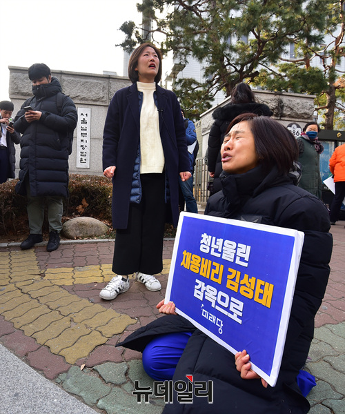 미래당, 민중당 회원들이 17일 오전 서울 양천구 서울남부지법에서 열린 김성태 전 자유한국당 의원의 자녀 채용청탁 의혹 1심 선고에서 무죄가 확정되자 김 의원을 규탄하는 손피켓을 들고 바닥에 앉아 소리를 지르고 있다.