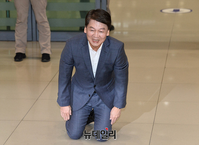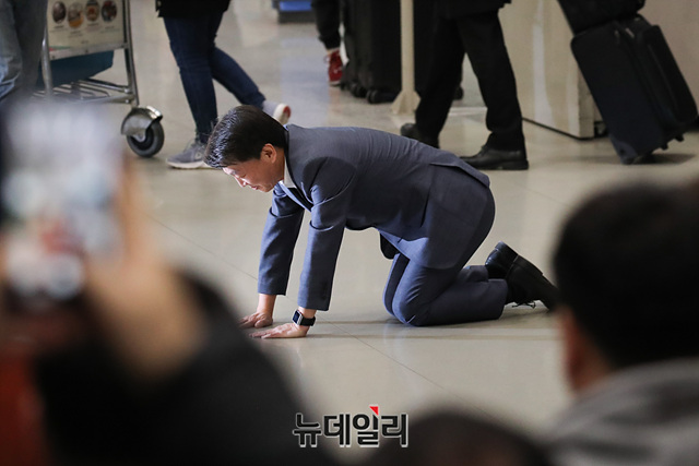 안철수 전 바른미래당 대표가 19일 오후 인천국제공항으로 1년 4개월여 만에 귀국하면서 지지자들에게 큰절을 하고 있다. (인천=박성원 기자)