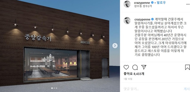 지난해 말 운영 중이던 '쵸이닷 레스토랑'를 폐점하고 소속사를 위플이앤디로 옮긴 최현석은 19일 서울 성수동에 퓨전레스토랑 '중앙감속기'를 오픈했다.