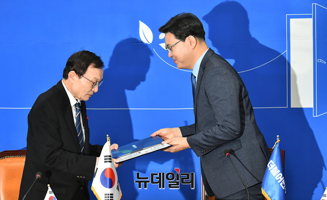 [포토] 민주당 입당원서 제출하는 최기일 방위산업 전문가