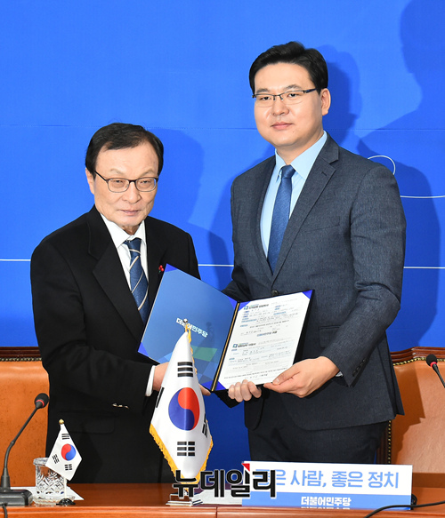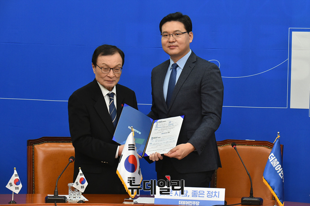 더불어민주당 11번째 영입인사인 최기일 방위산업 전문가가 21일 오전 국회에 열린 환영식에 참석해 입당 행사를 갖고 있다.