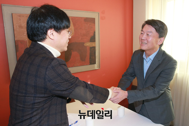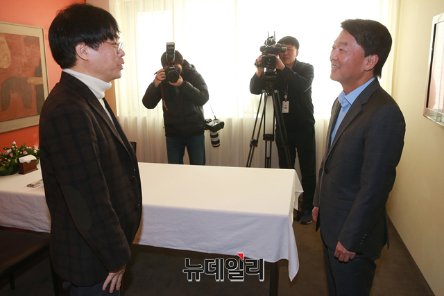 안철수 전 국민의당 대표가 21일 오후 서울 광화문 한 식당에서 김경율 전 참여연대 집행위원장을 만나 인사를 나누고 있다.