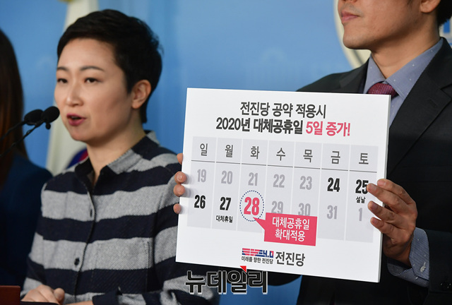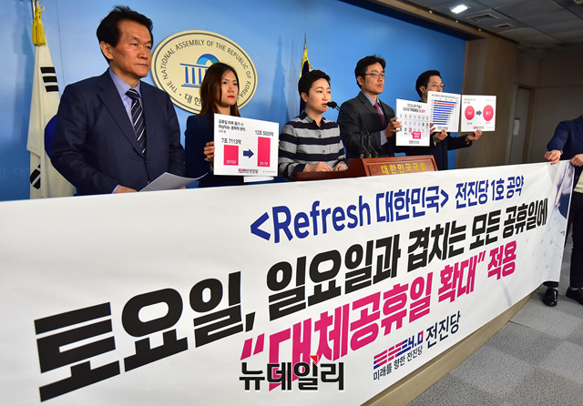 이언주 미래를향한전진4.0(전진당) 대표와 최고위원이 22일 오후 국회 정론관에서 토요일, 일요일과 겹치는 모든 공휴일에 '대체공휴일 확대' 적용의 내용을 담은 1호 공약을 발표하고 있다.