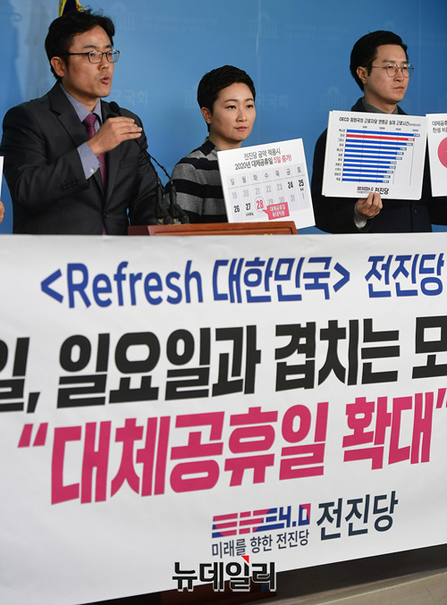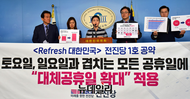 김원성 미래를향한전진4.0(전진당) 전략기획위원장이 22일 오후 국회 정론관에서 토요일, 일요일과 겹치는 모든 공휴일에 '대체공휴일 확대' 적용의 내용을 담은 1호 공약을 발표하고 있다.