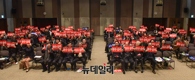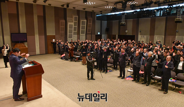 범보수연합이 22일 오후 서울 중구 한국프레스센터에서 열린 '범보수연합 출범식 및 신년교례회'에서 보수통합을 촉구하는 구호를 외치고 있다. 범보수연합은 보수통합과 중도로의 외연 확장을 목적으로 창립된 시민단체다.