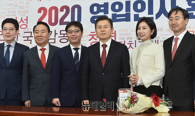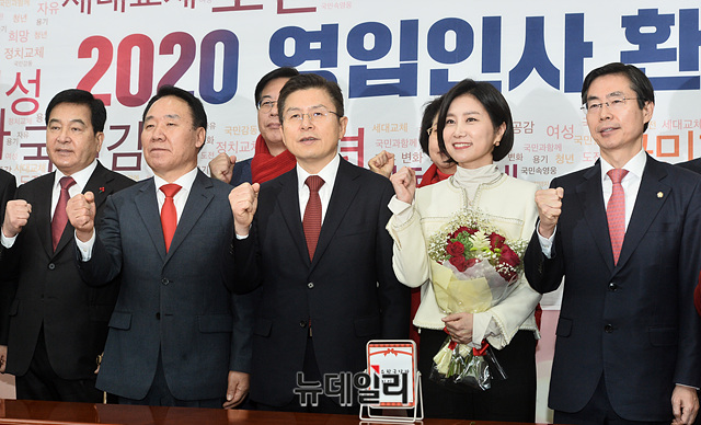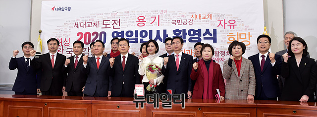 황교안 자유한국당 대표, 심재철 원내대표, 한국당 일곱 번째 영입 인사인 허은아 한국이미지전략연구소장 등 참석자들이 23일 오전 국회에서 열린 '2020년 영입인사 환영식'에서 기념촬영을 갖고 있다.