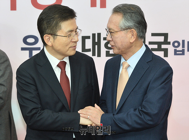 황교안 자유한국당 대표가 23일 오전 국회에서 열린 '자유한국당 4.15 총선 공천관리위원회 임명장 수여식'에서 김형오 공천관리위원장에게 임명장을 수여하고 있다.