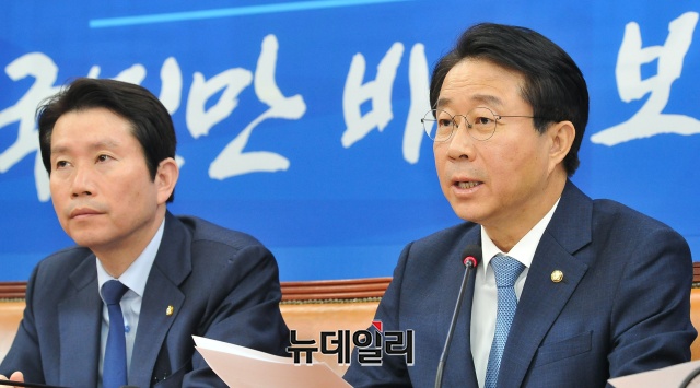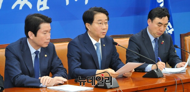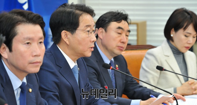 조정식 더불어민주당 정책위의장이 28일 오전 국회에서 열린 원내대책회의에서 모두발언을 하고 있다.