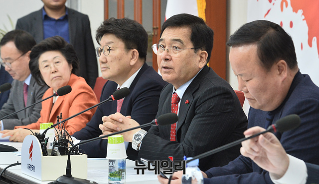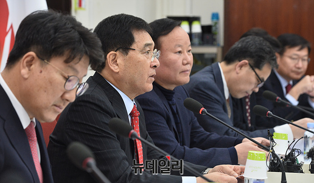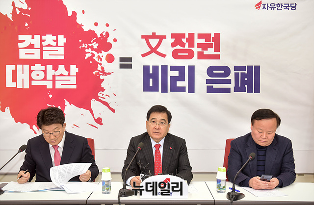 심재철 자유한국당 원내대표가 28일 오후 국회에서 열린 '한국당 검찰학살 TF 회의'에서 발언을 하고 있다.
