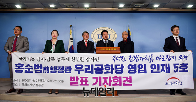 우리공화당 5호 영입인재로 임명된 홍순범 전 한국산업기술시험원(KTL) 전문위원이 28일 오후 국회 정론관에서 인재영입 관련 기자회견을 갖고 있다.