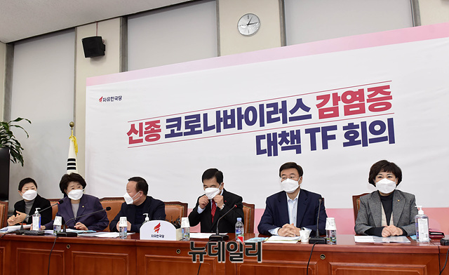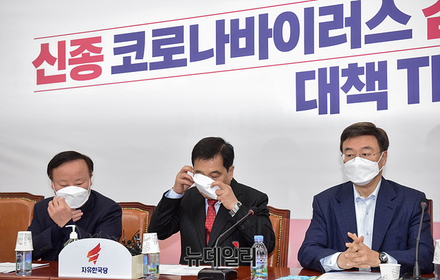 [포토] 마스크 착용하는 한국당 '코로나바이러스 대책 TF'