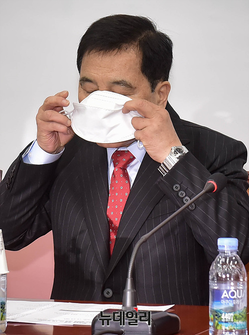 심재철 자유한국당 원내대표, 신상진 신종 코로나바이러스 감염증 대책 TF 위원장, 김재원 정책위의장 등 참석자들이 28일 오후 국회에서 열린 '한국당 신종 코로나바이러스 감염증 대책 TF회의'에 앞서 마스크를 착용하고 있다.
