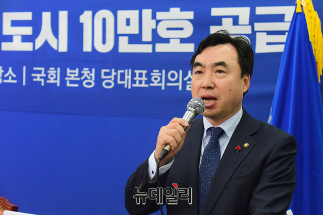 윤관석 더불어민주당 정책위수석부의장이 29일 오전 국회에서 열린 2020총선 공약발표에서 3호 총선 공약으로 청년·신혼 맞춤형 도시 조성 등을 통한 주택 10만호 공급을 발표하고 있다.