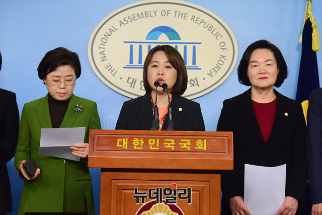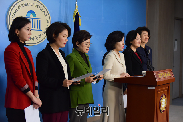 송희경 의원 등 자유한국당 여성의원, 중앙여성위원회 및 청년부대변인단이 29일 오전 국회 정론관에서 기자회견을 갖고 원종건씨의 미투 관련 규탄발언을 하고 있다.