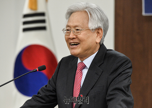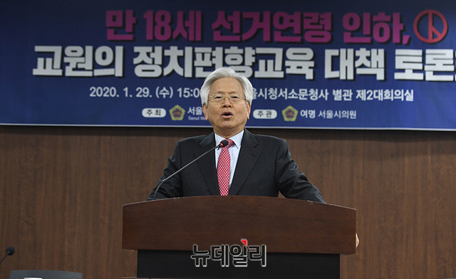 고영주 전 MBC 방송문화진흥회 이사장이 29일 오후 서울 중구 서울시청서소문청사 별관에서 열린 '만18세 선거연령 인하, 교원의 정치편향교육 대책 토론회'에서 인사말을 하고 있다.