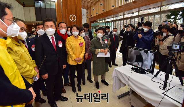 황교안 자유한국당 대표가 29일 오후 신종 코로나 바이러스 확산과 관련해 서초구청에서 열린 서초구 비상대책회의 직후 조은희 구청장과 함께 출입구에 설치된 열화상 카메라를 체험해보고 있다.