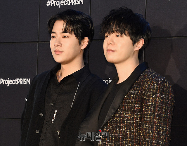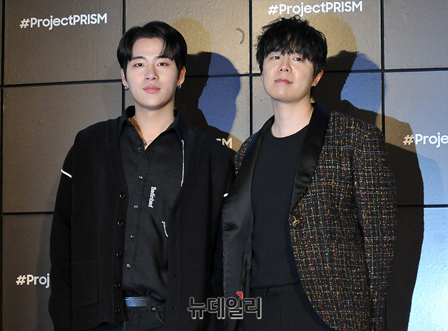 소프라노 색포니스트 멜로우키친(왼쪽), 가수 자이로가 29일 오후 서울 강남구 삼성디지털프라자 강남본점에서 열린 '삼성 그랑데 AI' 런칭 행사에서 포토타임을 갖고 있다.
