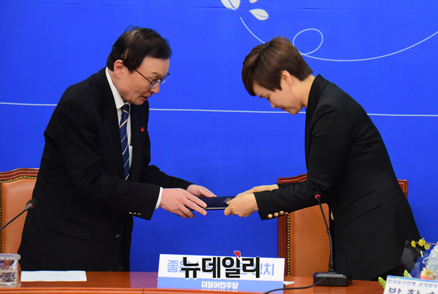 더불어민주당 15호 영입인재인 임오경 전 서울시청 여자 핸드볼팀 감독이 30일 오전 국회에서 열린 더불어민주당 인재영입 발표회에 참석해 이해찬 대표에게 입당 원서를 제출하고 있다.