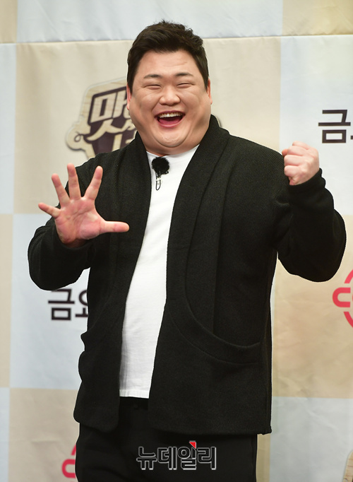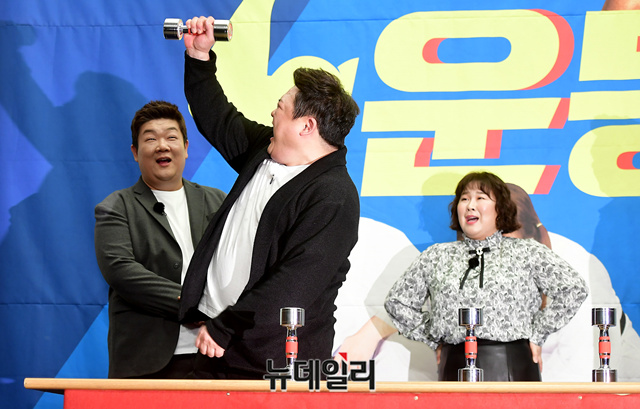 김준현이 30일 오전 서울 마포구 스탠포드호텔에서 열린 예능 '맛있는 녀석들' 5주년 기자간담회 직후 진행된 '시켜서한다, 오늘부터 운동뚱' 5주년 이벤트 대상자 선정에서 다이어트 대상자를 피하자 퍼포먼스를 하고 있다.대상자 선정은 테이블에 놓인 아령을 들어 아령을 들지 못하는 1인이 선정되는 방식으로 진행됐다. 대상자로 선정된 김민경은 양치승 트레이너에게 다이어트 트레이닝을 받게 된다. 이번 운동 이벤트는 5주년을 기념해 시청자들의 건의사항을 반영했다.