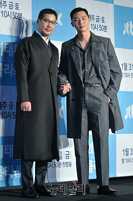 배우 유재명(왼쪽), 박서준이 30일 오후 서울 여의도 콘래드호텔에서 열린 드라마 ’이태원 클라쓰(연출 김성윤, 각본 광진)’ 제작발표회에서 포토타임을 갖고 있다.