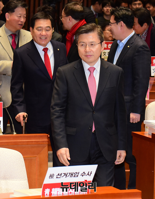 황교안 자유한국당 대표와 심재철 원내대표 등 소속 의원들이 30일 오후 국회에서 열린 의원총회에 참석하기 위해 입장하고 있다.