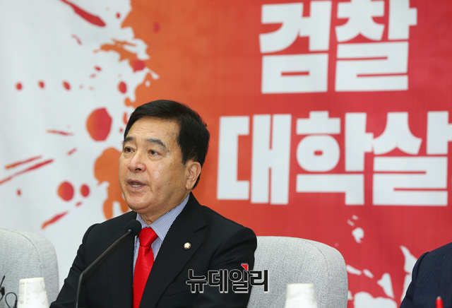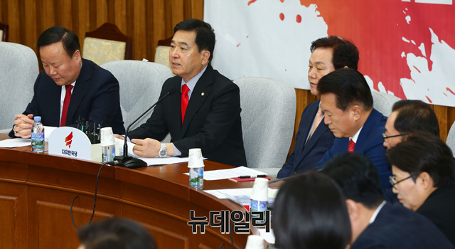 심재철 자유한국당 원내대표가 31일 오전 국회에서 열린 원내대책회의에서 모두발언을 하고 있다.