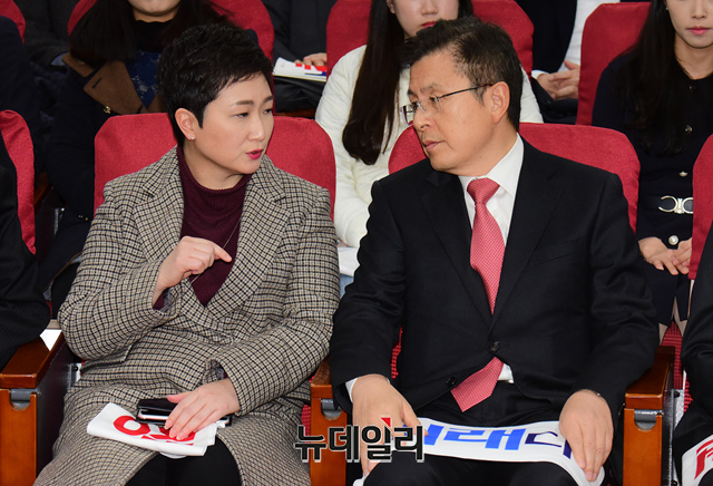 황교안 자유한국당 대표와 이언주 미래를 향한 전진 4.0 대표가 31일 오후 국회 의원회관에서 열린 혁신통합추진위원회 제1차 대국민보고대회에 참석해 대화를 나누고 있다.
