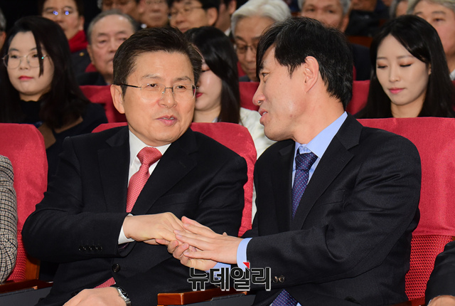 황교안 자유한국당 대표와 하태경 새로운보수당 책임대표 31일 오후 국회 의원회관에서 열린 혁신통합추진위원회 제1차 대국민보고대회에 참석해 대화를 나누고 있다.