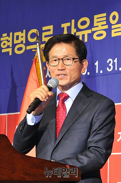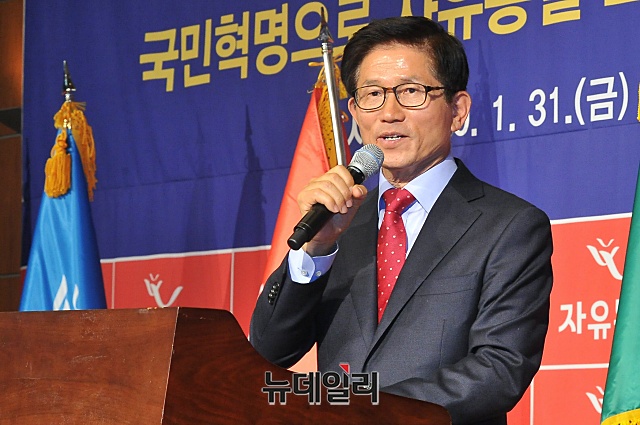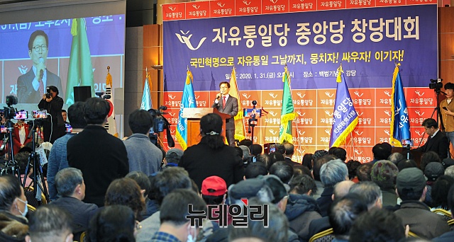 자유통일당 초대 당대표를 맡은 김문수 전 경기지사가 31일 오후 서울 용산구 백범김구기념관에서 열린 자유통일당 창당대회에서 당대표 수락연설을 하고 있다.