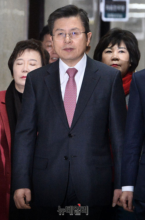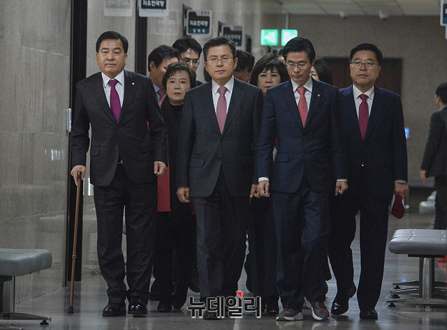 황교안 자유한국당 대표, 심재철 원내대표, 조경태 최고위원 등 지도부가 3일 오전 국회에서 열린 최고위원회의에 입장하고 있다.