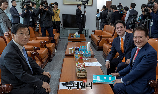 여야3당 교섭단체 원내수석부대표가 3일 오전 국회 운영위원장실에서 회동을 갖고 기념촬영을 하고 있다. (왼쪽부터 이동섭 바른미래당 원내수석부대표, 윤후덕 더불어민주당 원내수석부대표, 김한표 자유한국당 원내수석부대표)