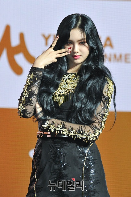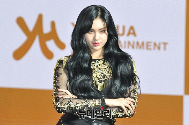 걸그룹 ‘에버글로우(EVERGLOW)’ 아샤가 3일 오후 서울 용산구 블루스퀘어 아이마켓홀에서 열린 첫 번째 미니앨범 ‘레미니선스(reminiscence)’ 쇼케이스에서 포토타임을 갖고 있다.