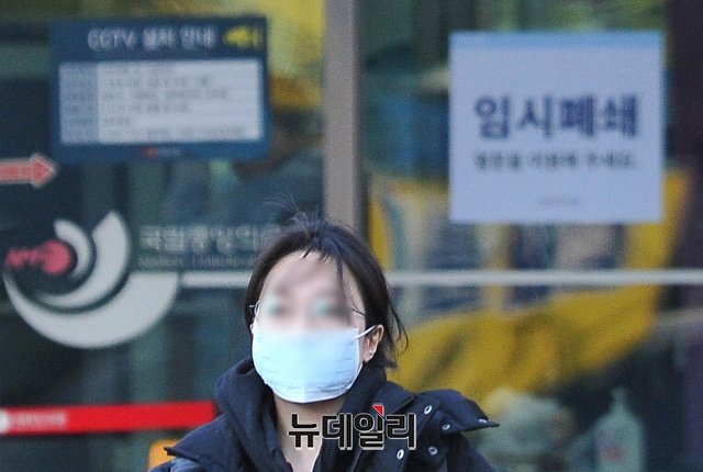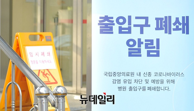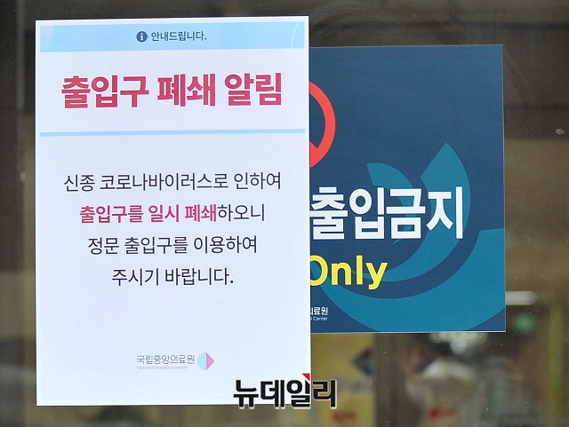 신종 코로나 바이러스 감염증 유행이 지속되는 3일 오후 서울 중구 국립중앙의료원에서 측면 출입구 일시폐쇄 안내문이 붙어있다.
