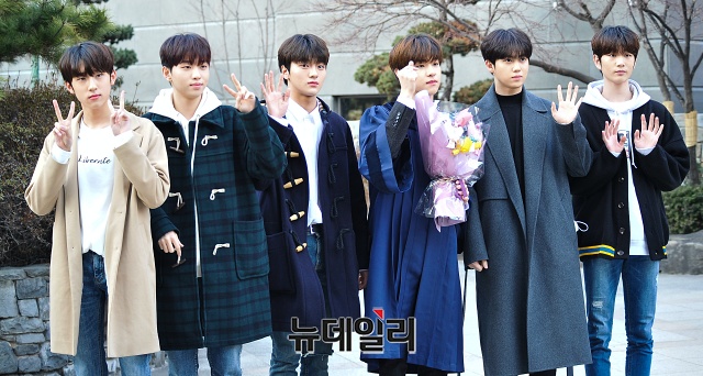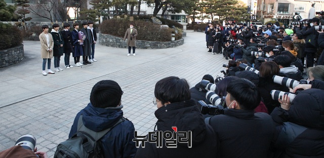 그룹 W프로젝트 김민서(왼쪽부터), 이협, 차준호, 김동윤, 황윤성, 주창욱이 4일 오전 서울 강남구 광림교회에서 열린 멤버 김동윤 졸업식에 참석해 포토타임을 갖고 있다.