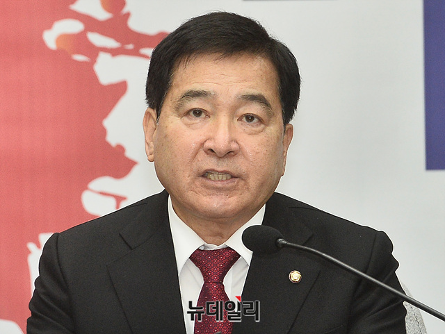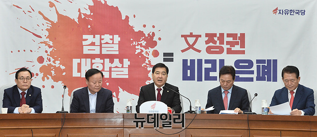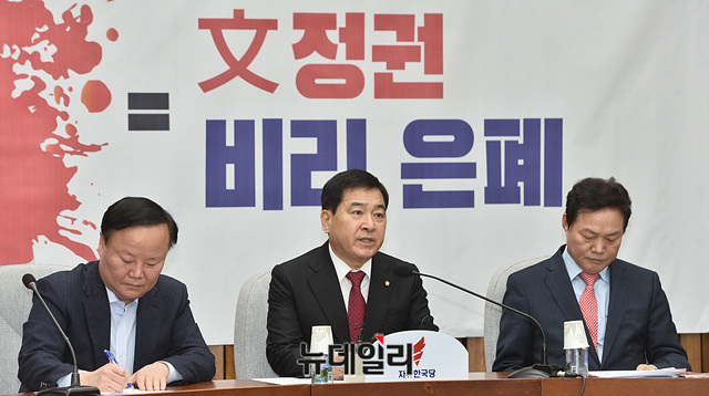 심재철 자유한국당 원내대표가 4일 오전 국회에서 열린 원내대책회의에서 모두발언을 하고 있다.