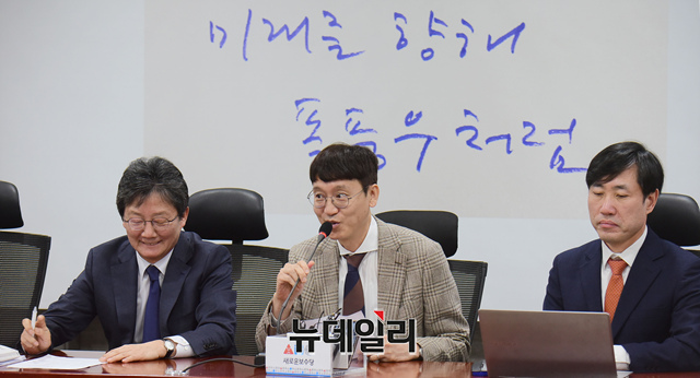 김웅 전 부장검사가 4일 오전 국회 의원회관에서 열린 새로운보수당 인재영입 환영식에 참석해 인사말을 하고 있다.