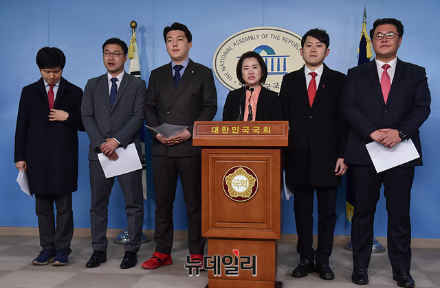 총학생회장 출신 자유한국당 청년들이 4일 오전 국회 정론관에서 제21대 총선 합동 출마 선언 기자회견을 갖고 있다. (왼쪽부터 이영수 전 한남대학교 총학생회장, 박진호 전 한국산업기술대학교 총학생회장, 김성용 전 국립 공주대학교 총학생회장, 김찬영 전 아주대학교 총학생회장, 장능인 전 KAIST ICC 총학생회장)