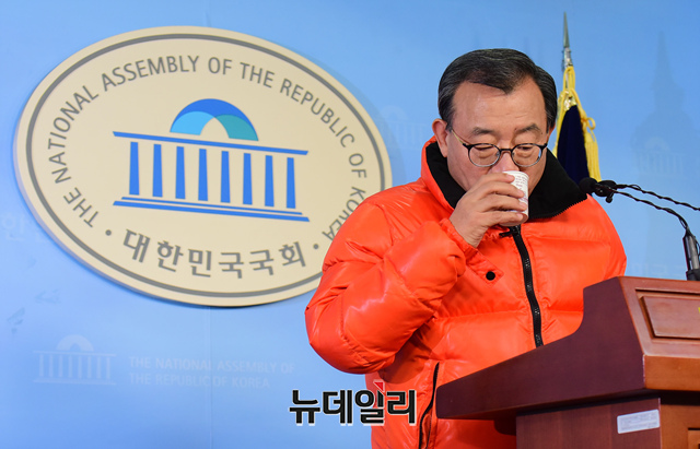 이정현 무소속 의원이 4일 오전 국회 정론관에서 21대 총선 종로 출마 기자회견을 마치고 물을 마시고 있다.