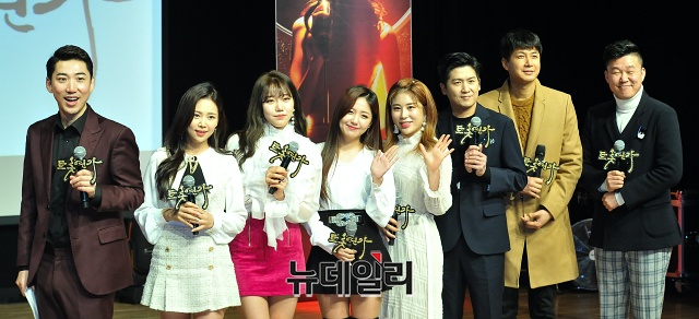 권영기(왼쪽부터), 강예슬, 김희진, 정다경, 김소유, 홍경민, 김승현, 홍록기가 5일 오후 서울 강남구 일지아트홀에서 열린 뮤지컬 ’트롯연가’ 제작발표회에서 포토타임을 갖고 있다.