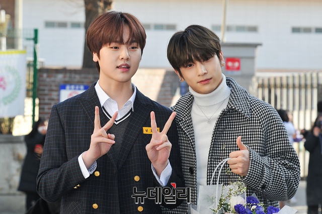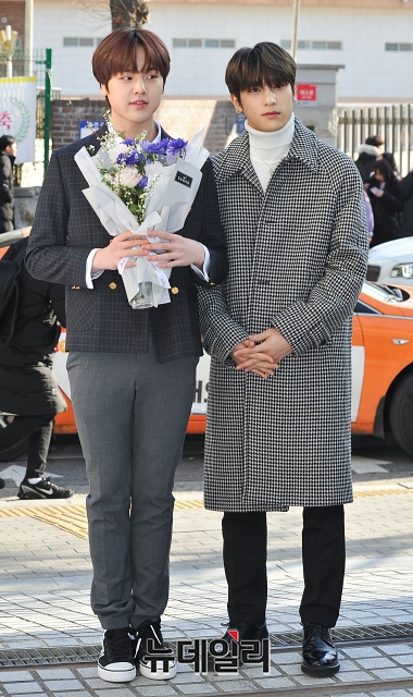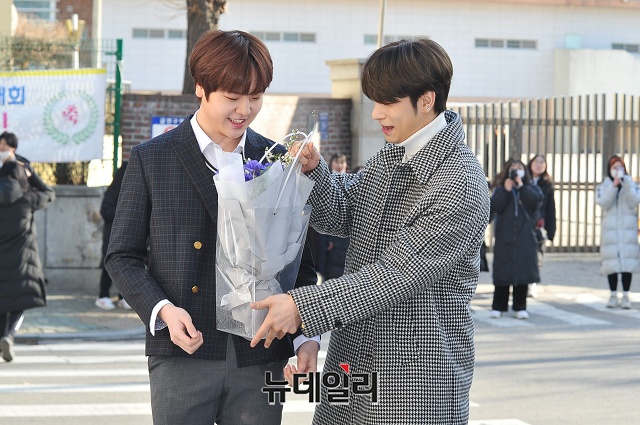 그룹 X1 멤버 이한결(오른쪽)이 6일 오전 서울 강남구 대치중학교에서 열린 남도현 졸업식에 참석해 축하꽃다발을 전해주고 있다.
