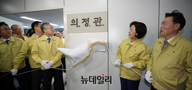 추미애 법무부장관, 김오수 법무부 차관, 김영대 고검장 등 참석자들이 6일 오전 서울 서초구 서울고등검찰청 내 법무부 대변인실 사무실 '의정관' 개소식에 참석해 현판식을 하고 있다.