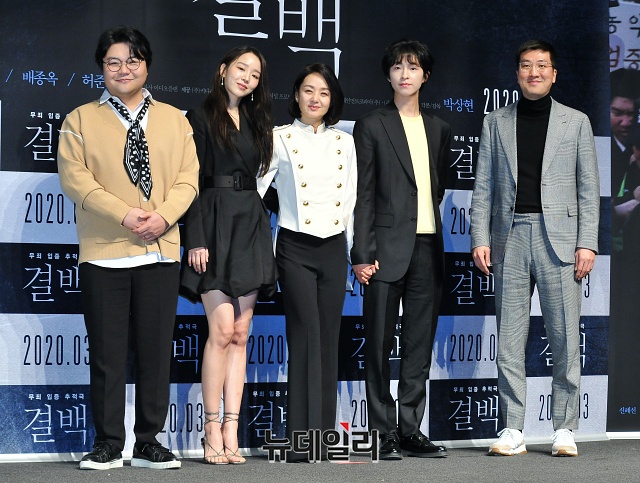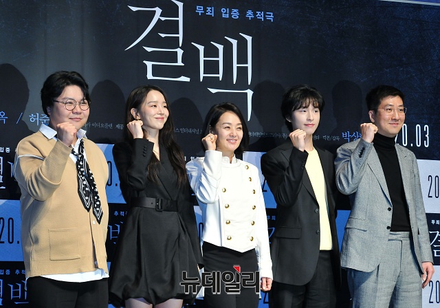 배우 태항호(왼쪽부터), 신혜선, 배종옥, 홍경, 박상현 감독이 6일 오전 서울 강남구 압구정CGV에서 열린 영화 ‘결백(감독 박상현)’ 제작발표회에서 포토타임을 갖고 있다.