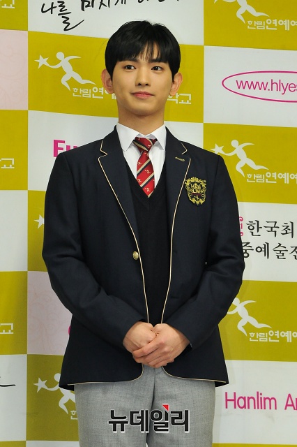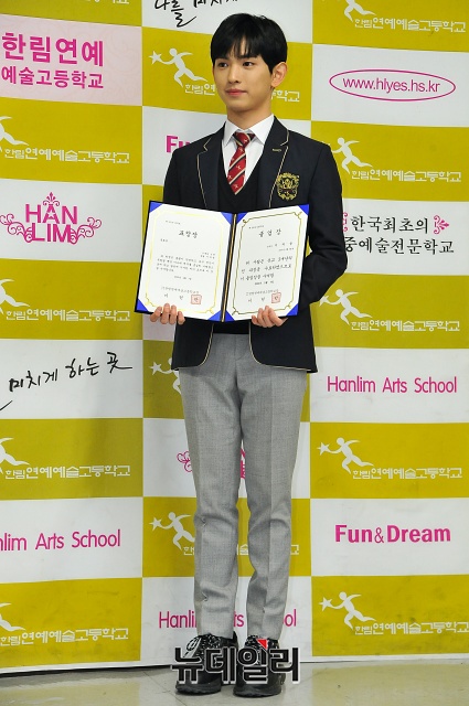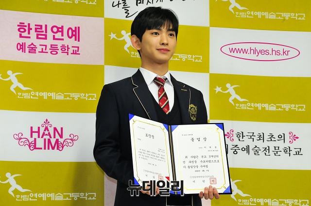 가수 이의웅이 7일 오전 서울 송파구 한림연예예술고등학교 졸업식에서 포토타임을 갖고 있다.