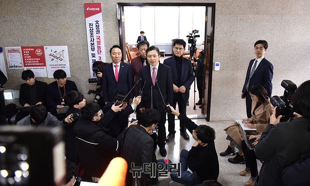 황교안 자유한국당 대표가 7일 오전 국회에서 열린 '2020년 자유한국당 영입 인사 환영식'을 마친 직후 취재진의 '종로 출마' 관련 질문에 답하고 있다.