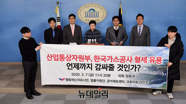 이언주 미래를향한전진4.0 대표와 행동하는자유시민이 7일 오전 국회 정론관에서 열린 '산업통상자원부, 한국가스공사 혈세 유용' 관련 기자회견을 하고 있다.이날 참석자들은 "한국가스공사의 임직원들이 국민의 세금으로 전 직원들의 오락용 태블릿 PC를 구매한 사건 등의 전횡을 현 정권 산업통상부 고위진들이 감싸고 있거나 그것이 아니라면 국가기관으로서 직무유기를 하고 있다"고 말하면서 "한국가스공사 임직원들 뿐 아니라 현재 산업통상부의 실세들 역시도 직무유기죄로 고발할 것"이라고 말했다.'행동하는자유시민'은 자유민주주의를 지키기 위해 출범한 약 2,500명의 회원이 있는 정치시민단체다.